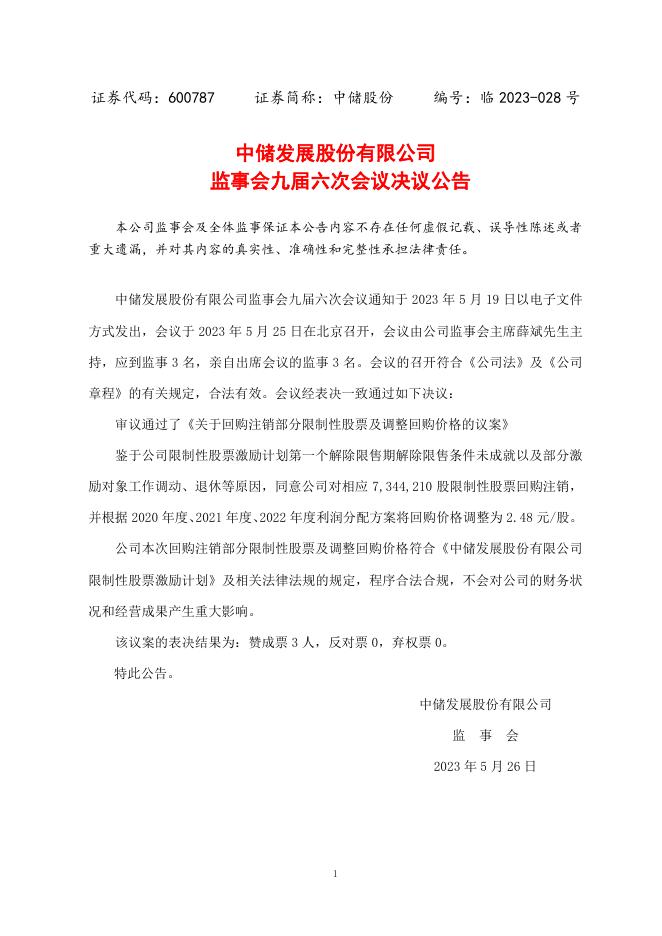 600787_20230526_中储发展股份有限公司监事会九届六次会议决议公告.pdf