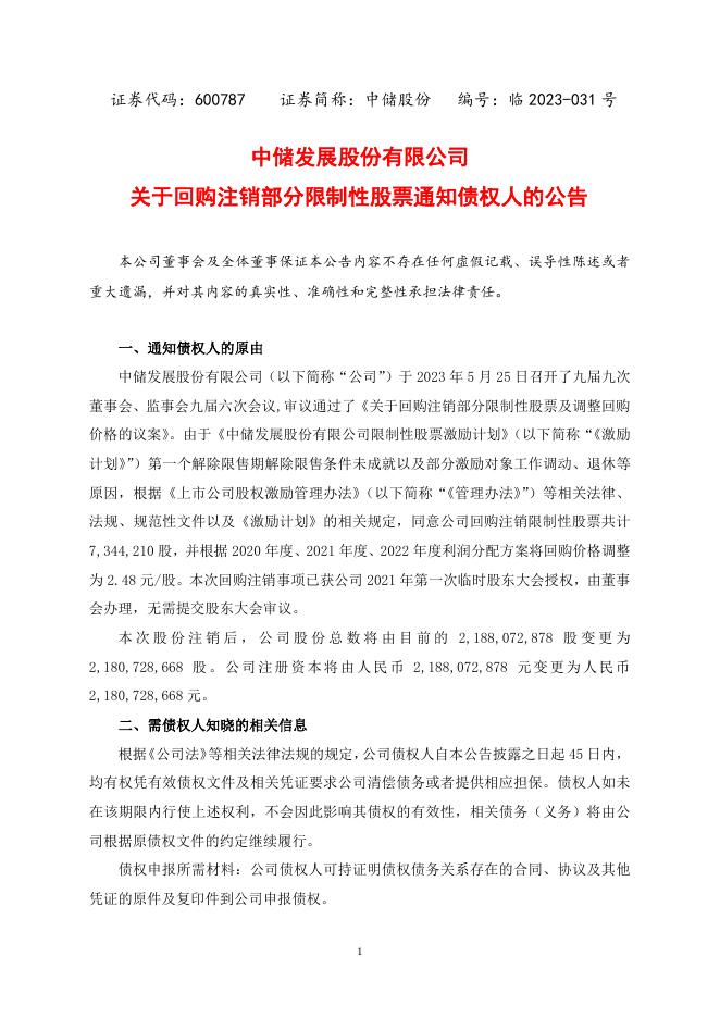 600787_20230526_中储发展股份有限公司关于回购注销部分限制性股票通知债权人的公告.pdf