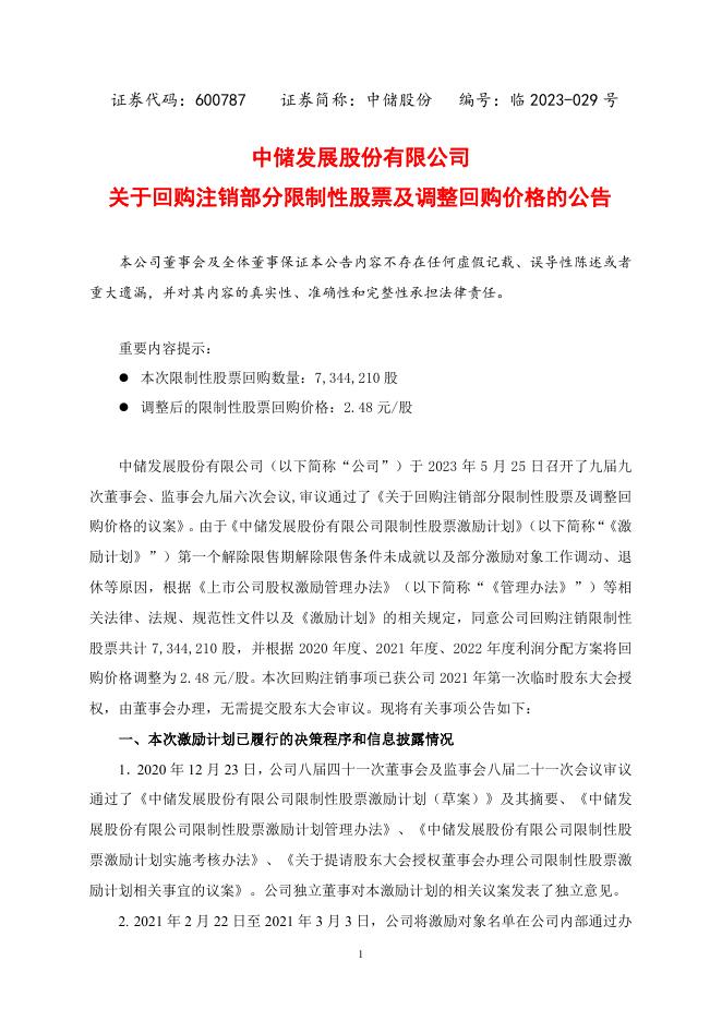 600787_20230526_中储发展股份有限公司关于回购注销部分限制性股票及调整回购价格的公告.pdf