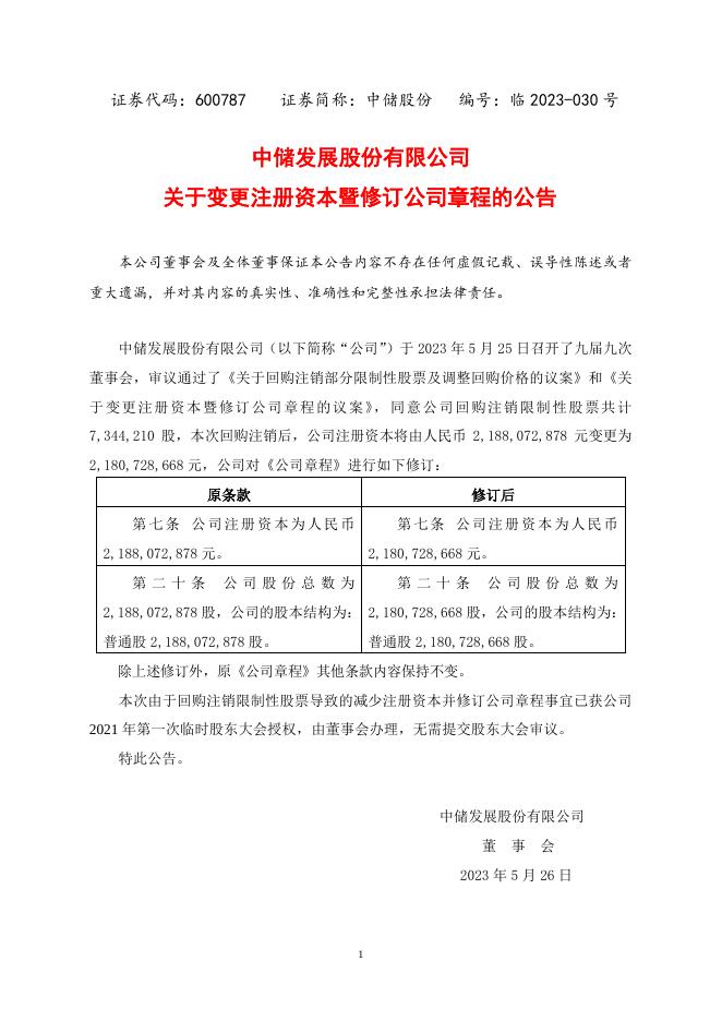 600787_20230526_中储发展股份有限公司关于变更注册资本暨修订公司章程的公告.pdf