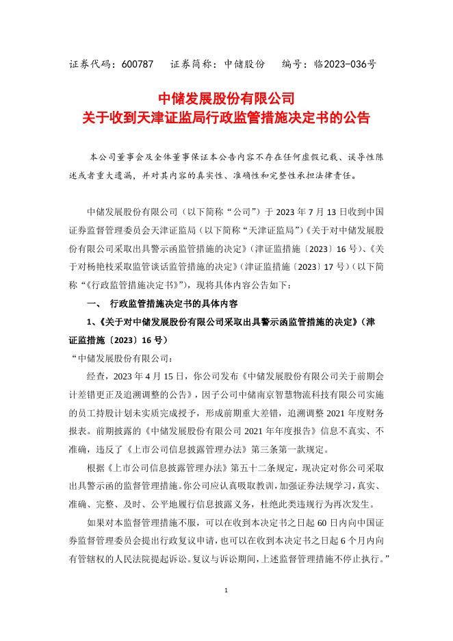 2023-07-15:中储股份:中储发展股份有限公司关于收到天津证监局行政监管措施决定书的公告.pdf