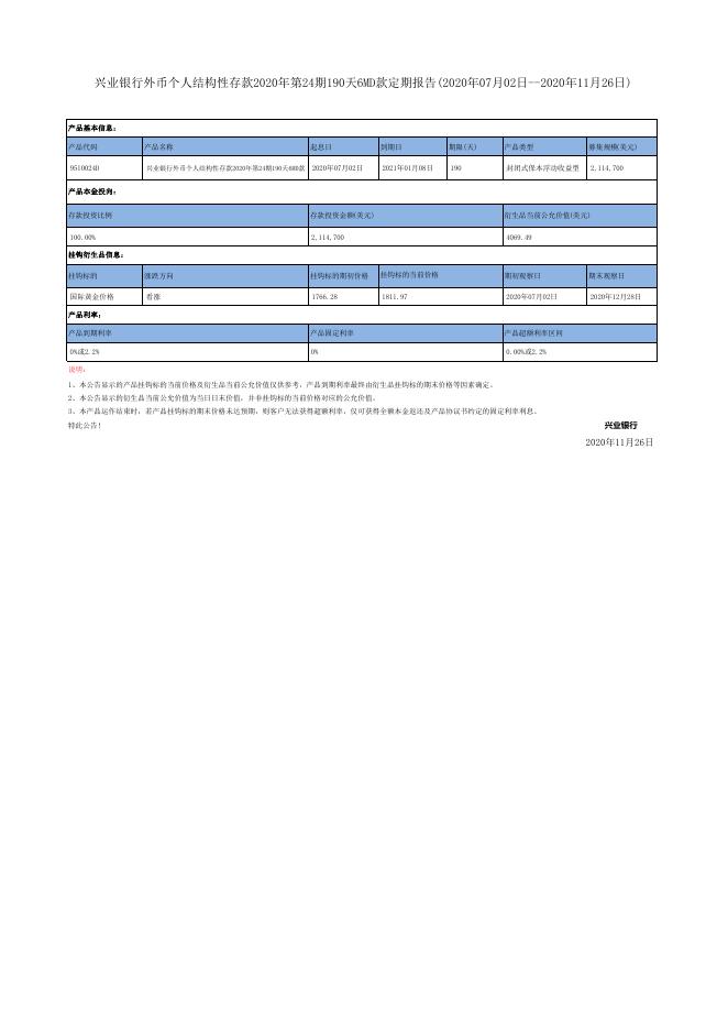 兴业银行外币个人结构性存款2020年第24期190天6MC款定期报告(2020年07月02pdf