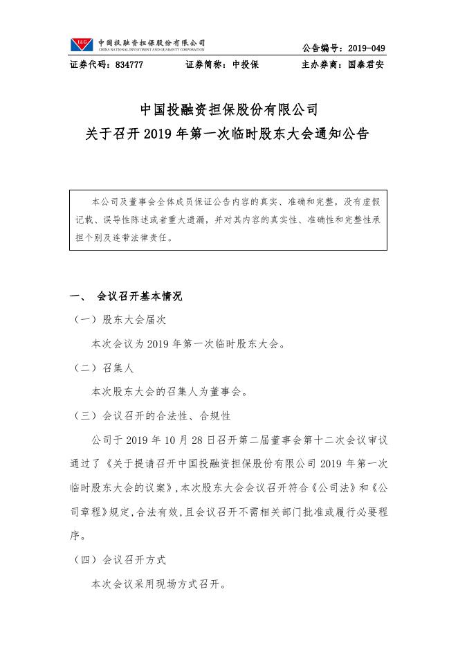 中国投融资担保股份有限公司关于召开2019年第一次临时股东大会通知的公告.pdf