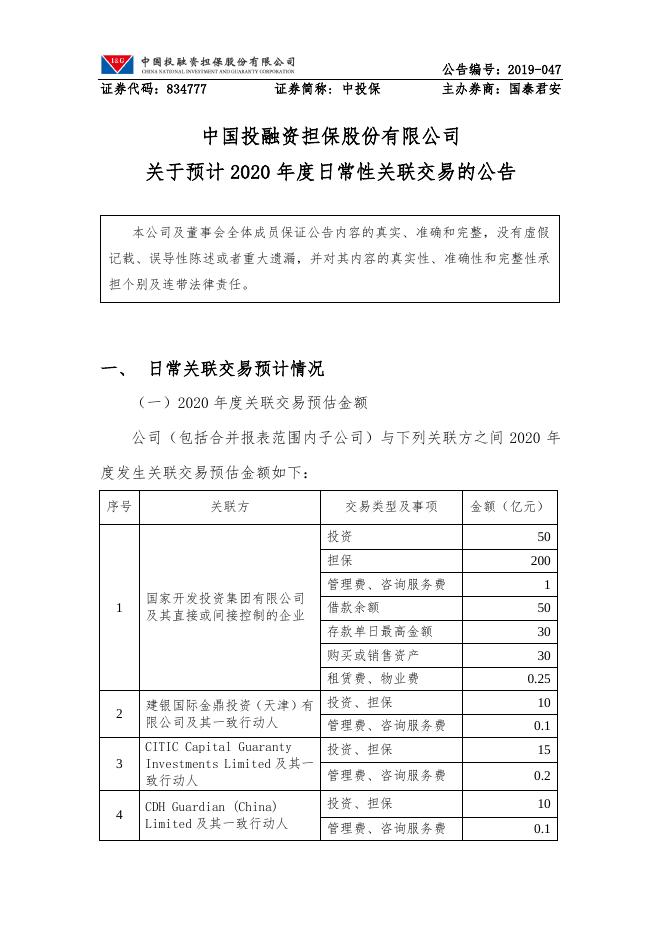 中国投融资担保股份有限公司关于预计2020年度日常性关联交易的公告.pdf