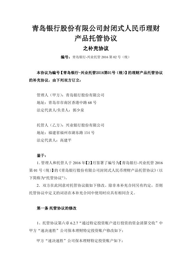 青岛银行股份有限公司封闭式人民币理财产品托管协议之补充协议.pdf
