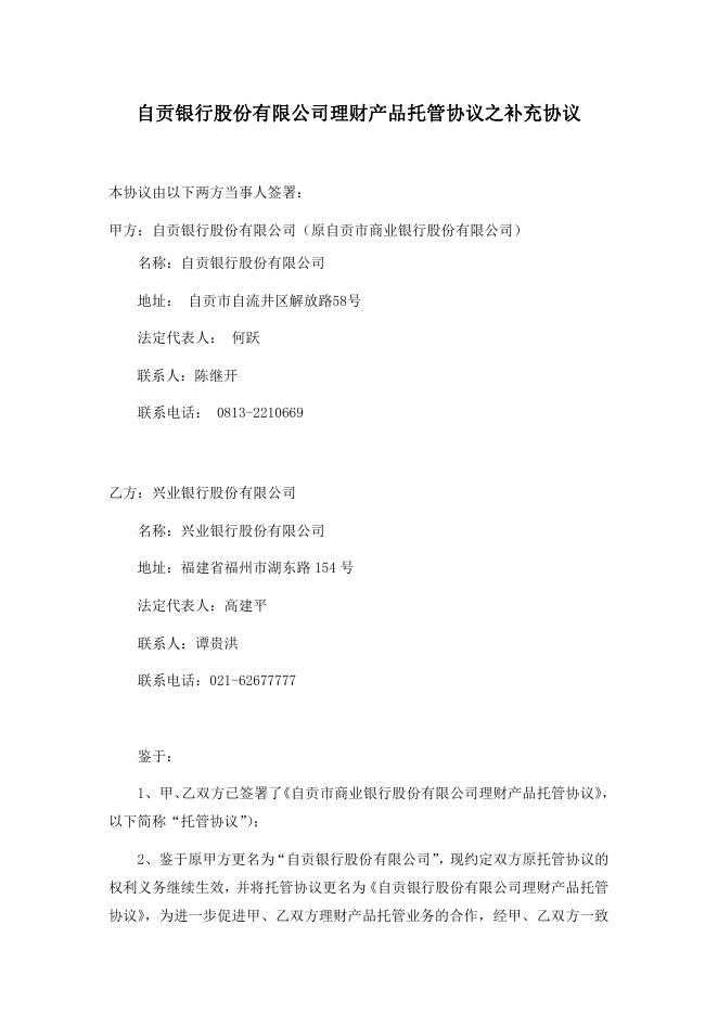 自贡银行股份有限公司理财产品托管协议之补充协议.pdf