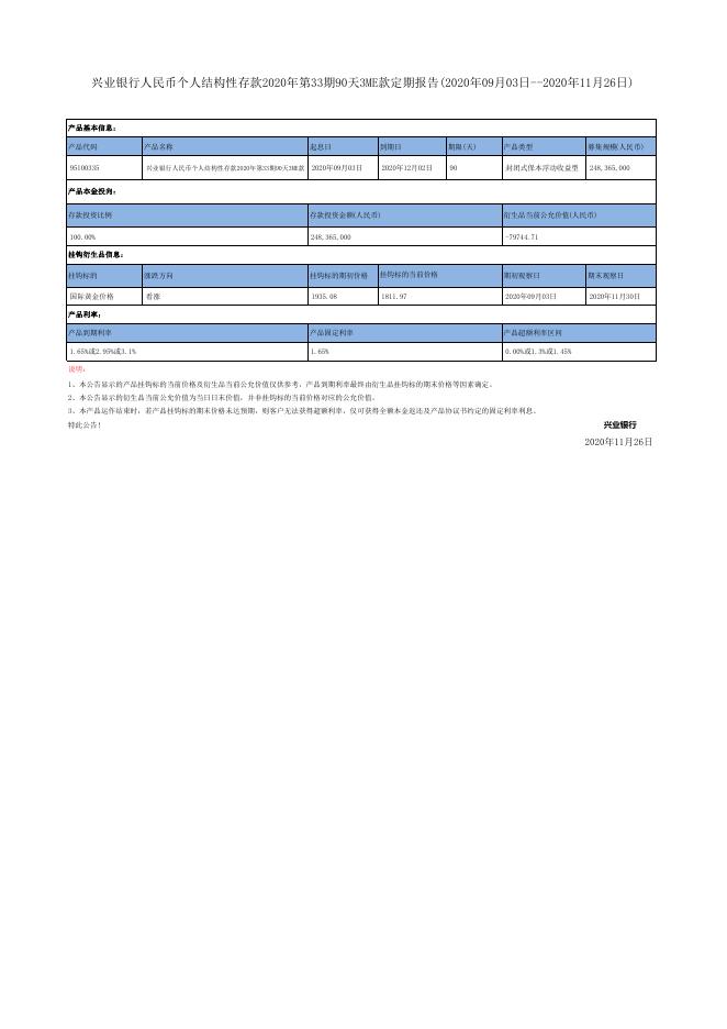 兴业银行人民币个人结构性存款2020年第33期90天3ME款定期报告(2020年09月03pdf