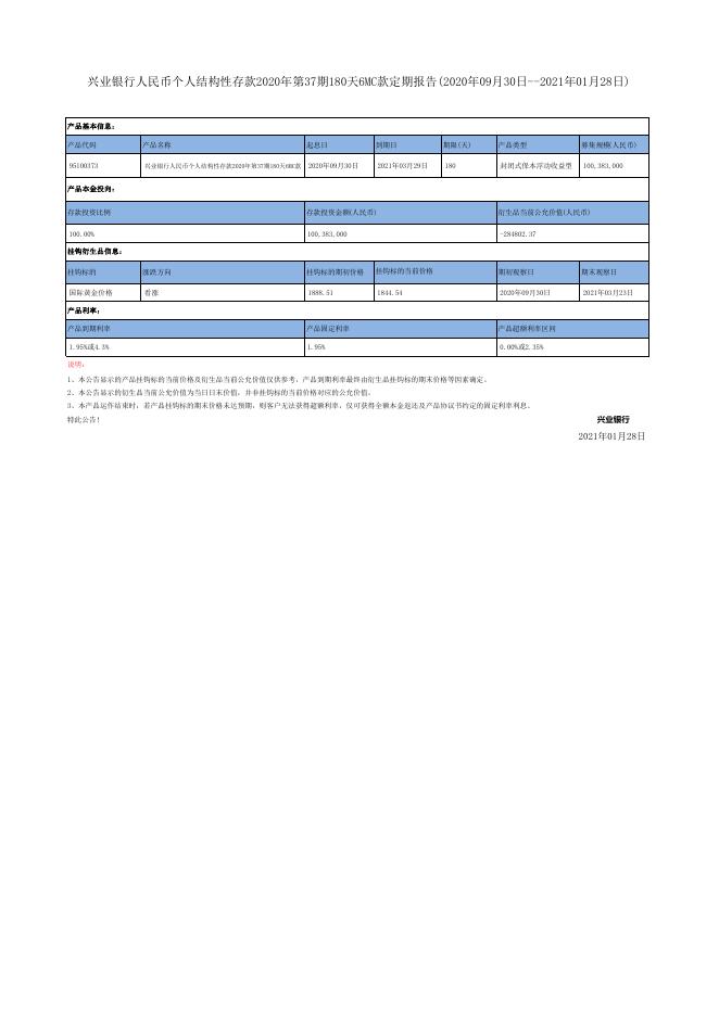 兴业银行人民币个人结构性存款2020年第37期180天6MC款定期报告(2020年09月3pdf