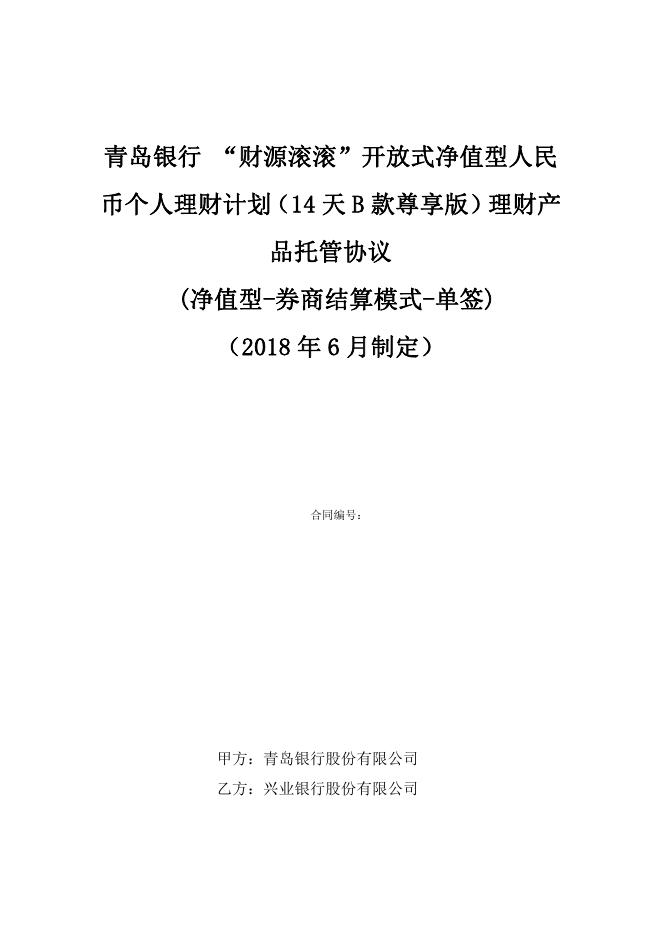青岛银行“财源滚滚”开放式净值型人民币个人理财产品计划(14天B款尊享版)理财产品托管协议(净值型-券商结算模式-单签).pdf