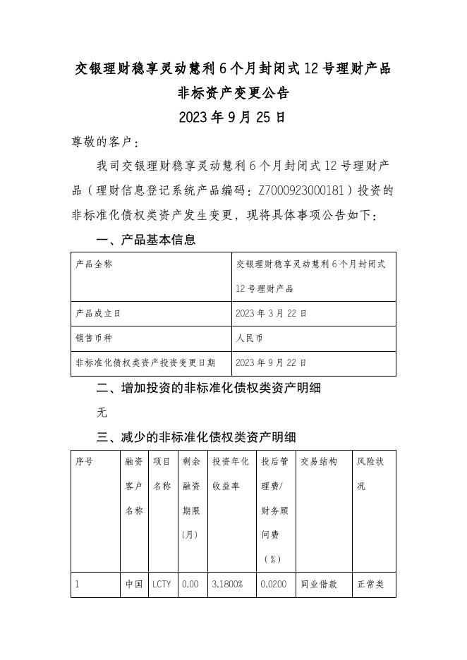 交银理财稳享灵动慧利6个月封闭式12号理财产品非标资产变更公告(2023年9月25日).pdf