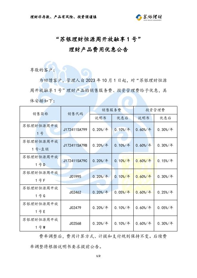 “苏银理财恒源周开放融享1号”理财产品费用优惠公告(2023年10月1日执行).pdf