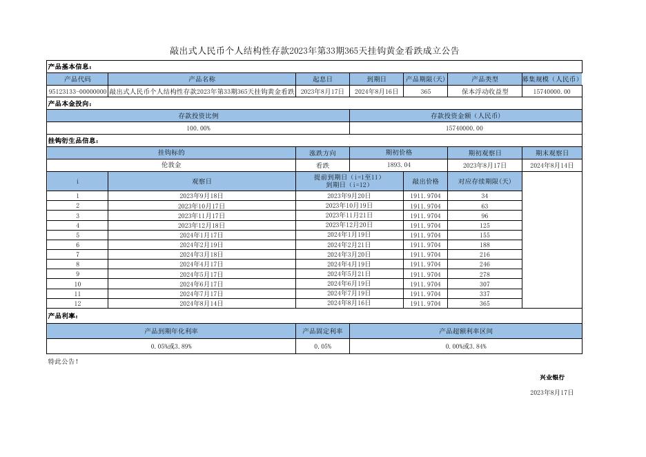 敲出式人民币个人结构性存款2023年第33期365天挂钩黄金看跌成立公告-95123133pdf