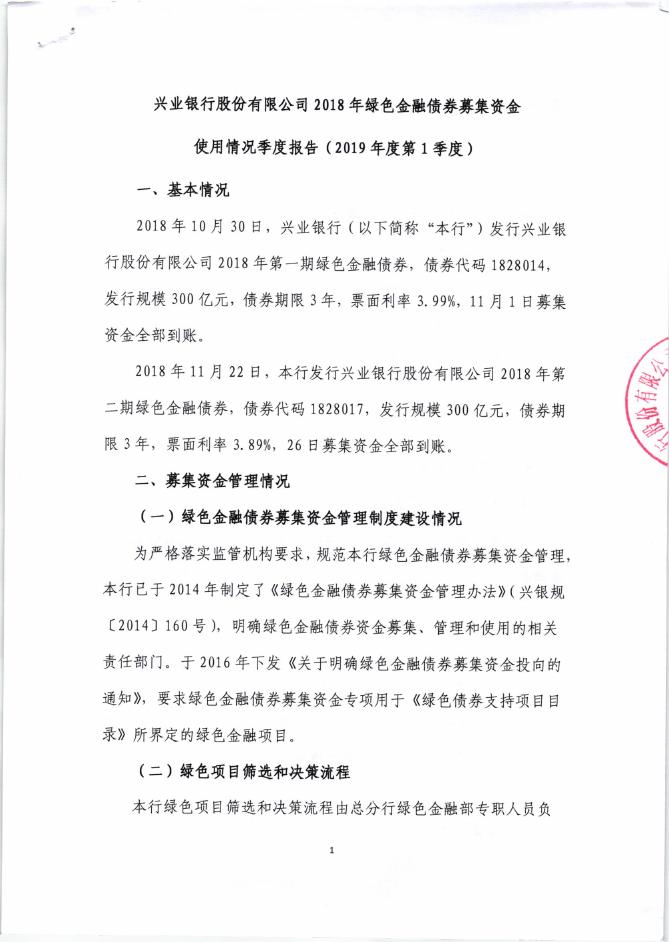 兴业银行股份有限公司2018年绿色金融债券募集资金使用情况年度报告(2019年度第1季度).pdf