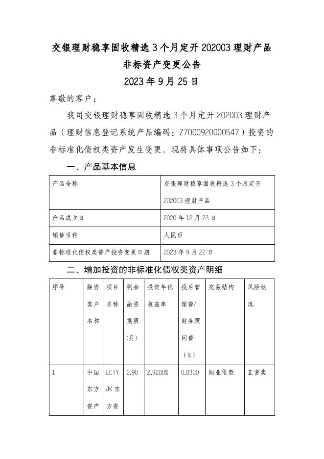 交银理财稳享固收精选3个月定开202003理财产品非标资产变更公告(2023年9月25日).pdf