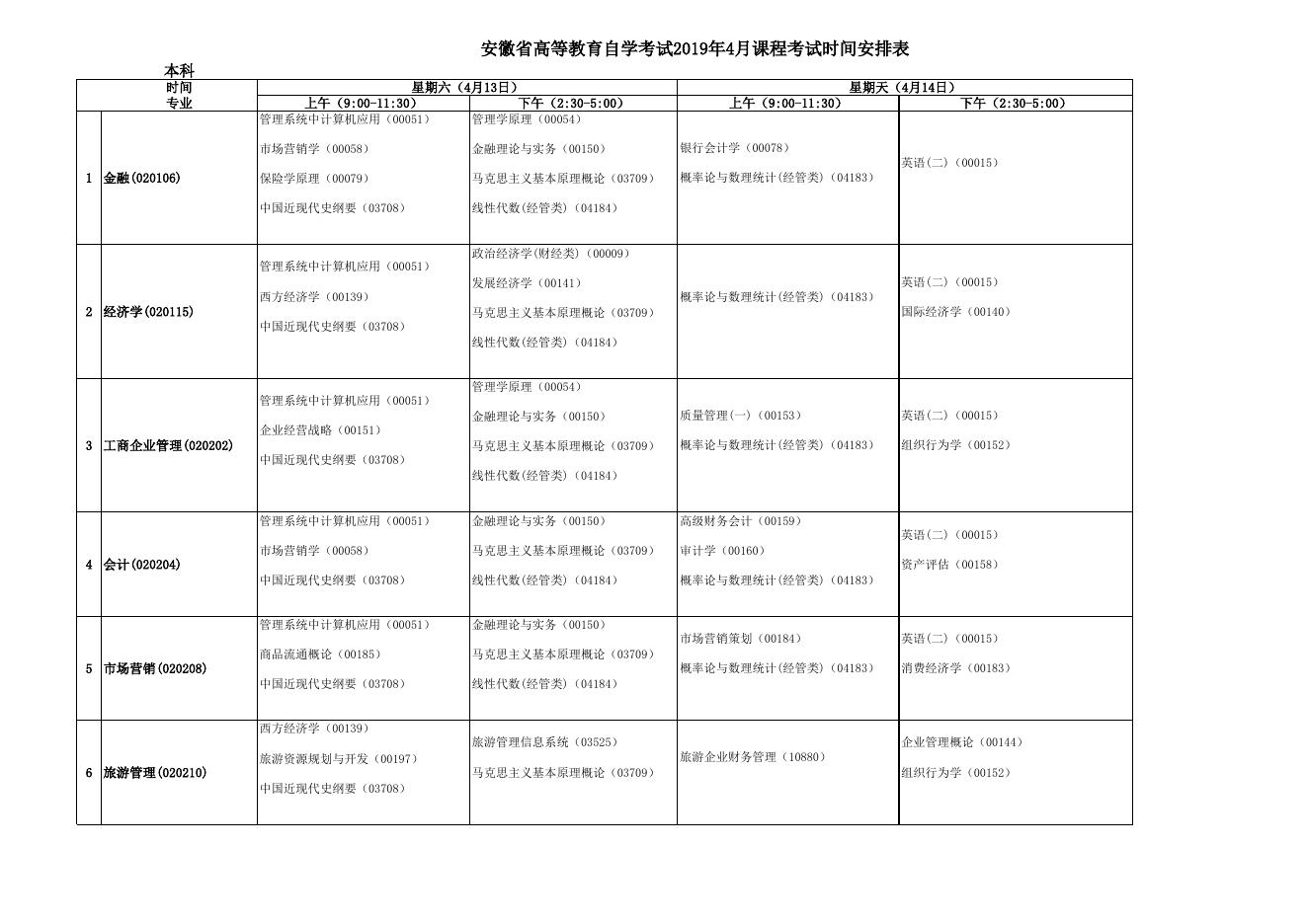 转发安徽省教育招生考试院关于印发《2019年4月安徽省高等教育自学考试课程安排》的通知-学院动态 - 安徽合肥财经职业学院-专注于人工智能制造职高,直播电商职业大专招生.xls