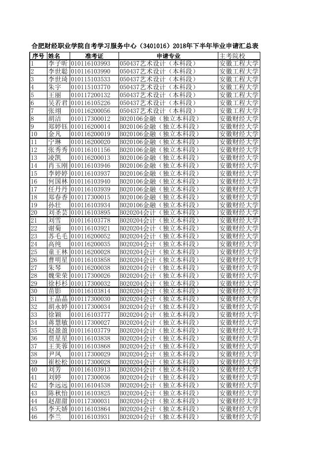 合肥财经职业学院自考学习服务中心2018年下半年毕业申请工作-学院动态 - 安徽合肥财经职业学院-专注于人工智能制造职高,直播电商职业大专招生.xls