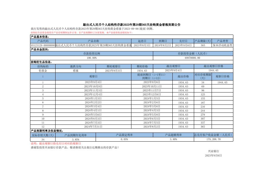 敲出式人民币个人结构性存款2023年第29期365天挂钩黄金看涨到期公告-95123129pdf