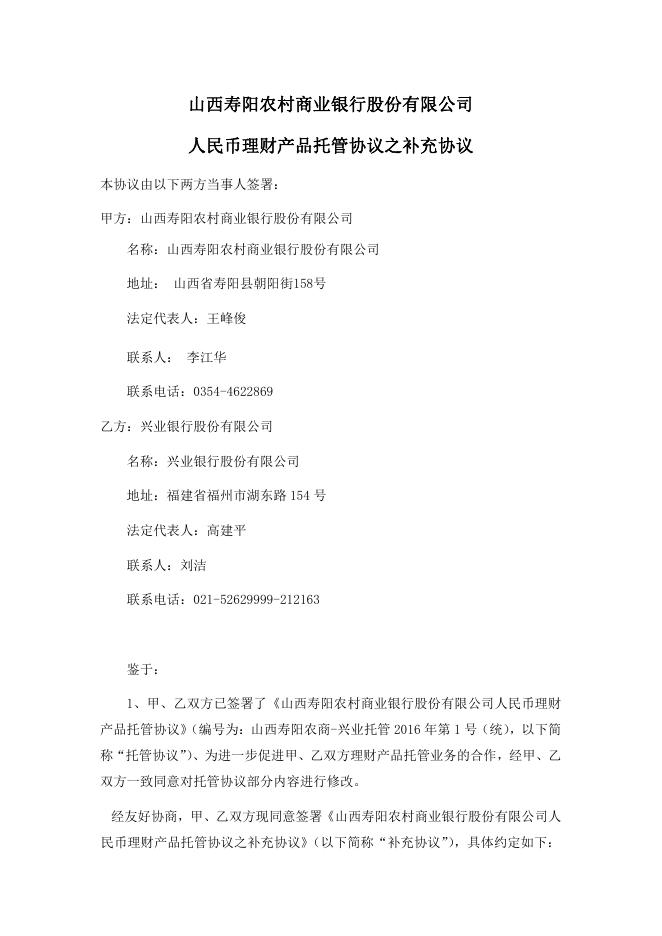 山西寿阳农村商业银行股份有限公司人民币理财产品托管协议之补充协议.pdf