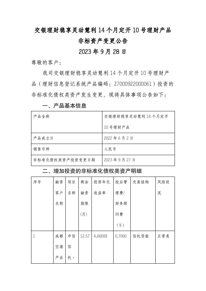 交银理财稳享灵动慧利14个月定开10号理财产品非标资产变更公告(2023年9月28日).pdf