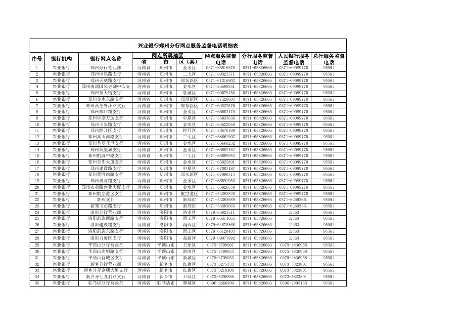 兴业银行郑州分行网点服务监督电话明细表.xls