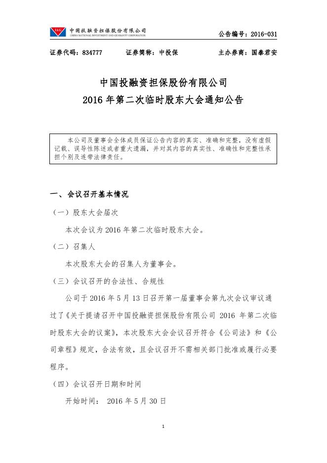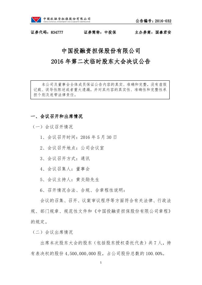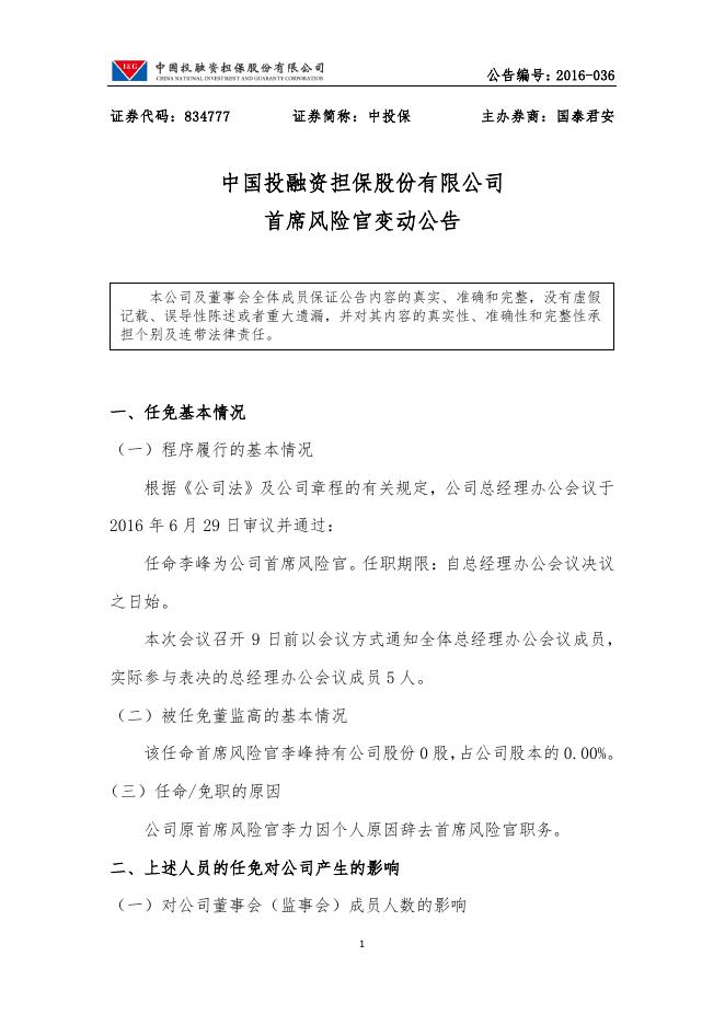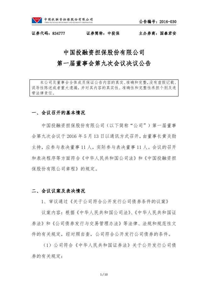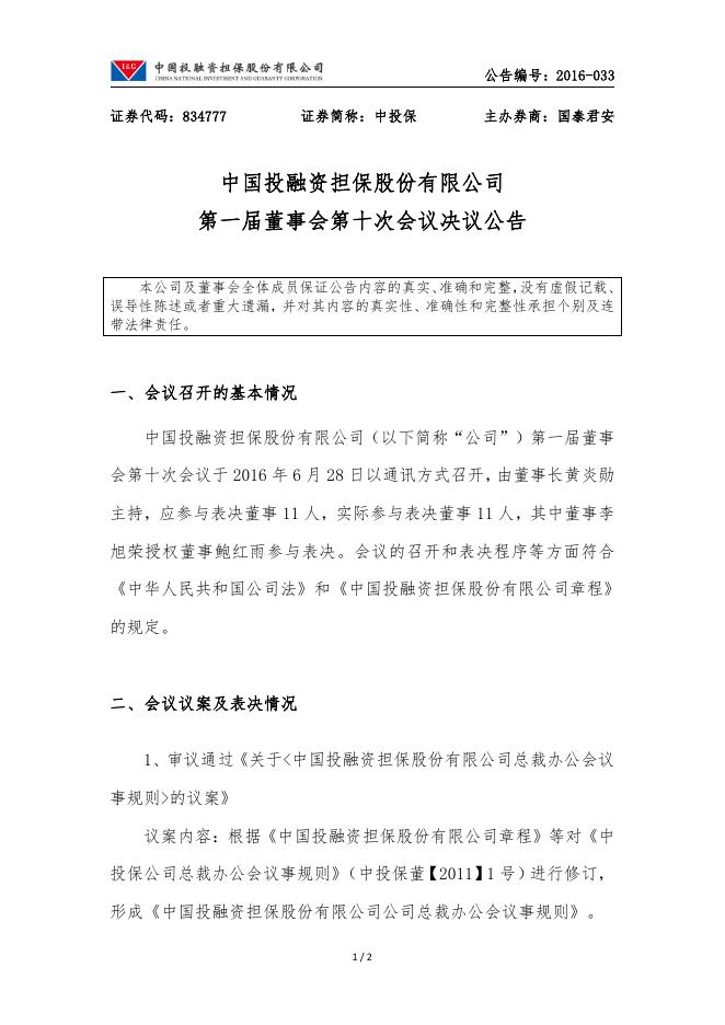 中国投融资担保股份有限公司第一届董事会第十次会议决议公告.pdf