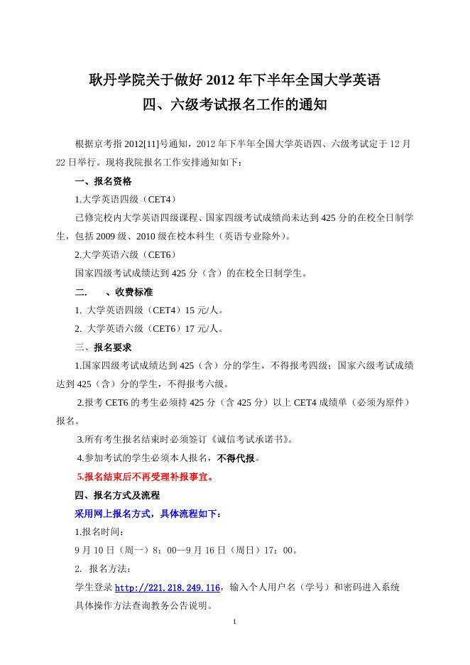 耿丹学院关于做好2012年下半年全国大学英语四、六级考试报名工作的通知.doc