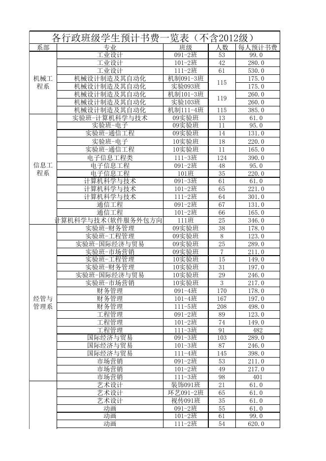 2012年秋季学期各行政班学生用书预计书费一栏表.xls