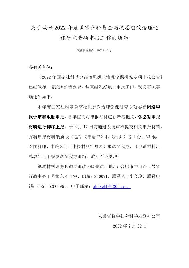 1.皖社科规划办〔2022〕13号 关于做好2022年度国家社科基金高校思想政治理论课研究专项申报工作的通知.docx