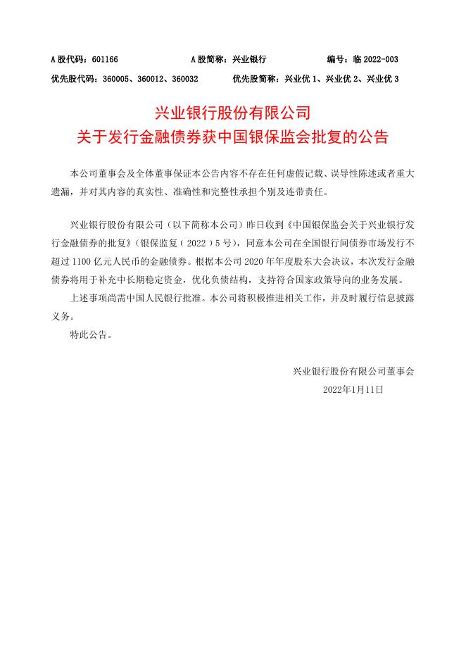 兴业银行关于发行金融债券获中国银保监会批复的公告.docx