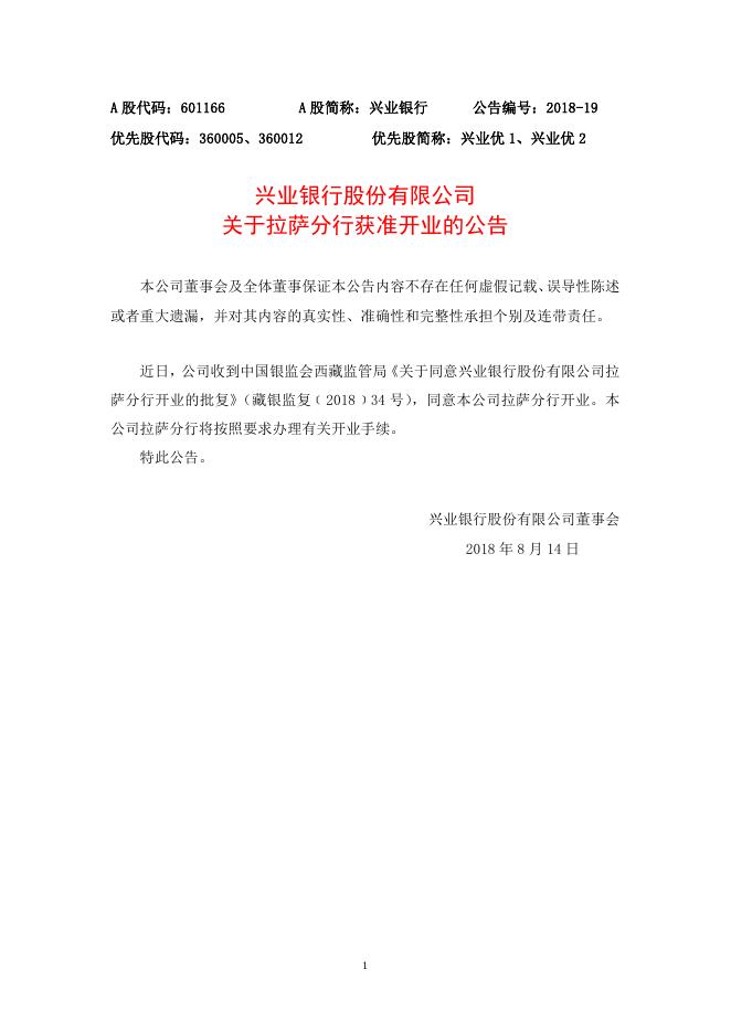 兴业银行股份有限公司关于非公开发行境内优先股获中国银保监会核准的公告.doc