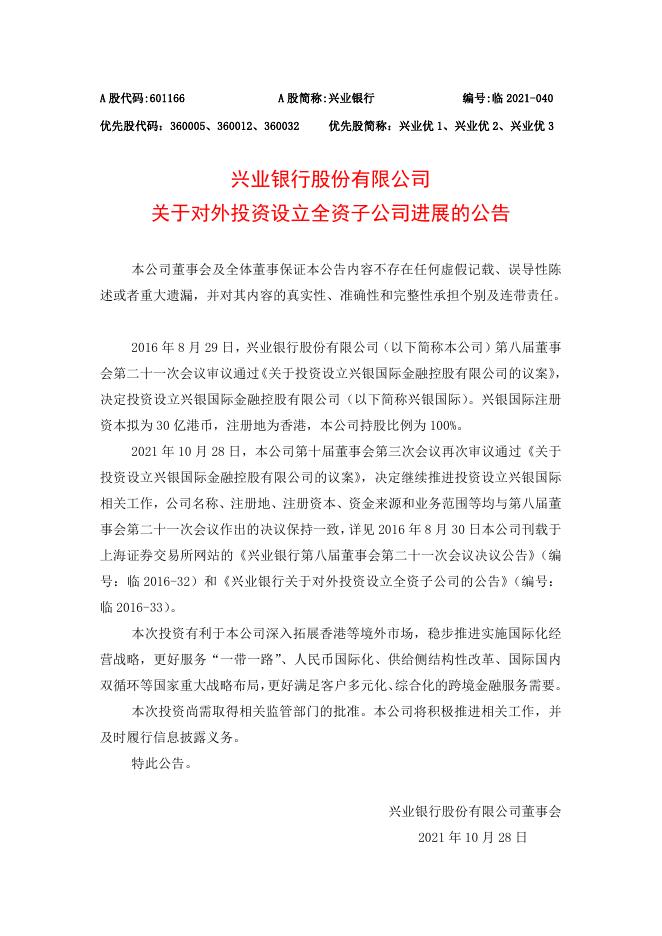 兴业银行关于对外投资设立全资子公司进展的公告.doc