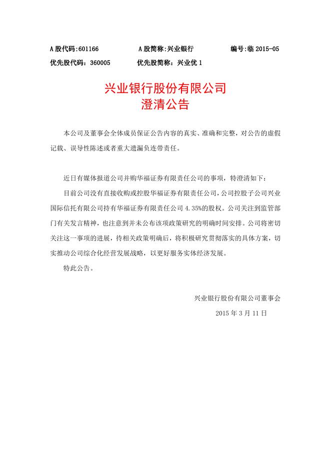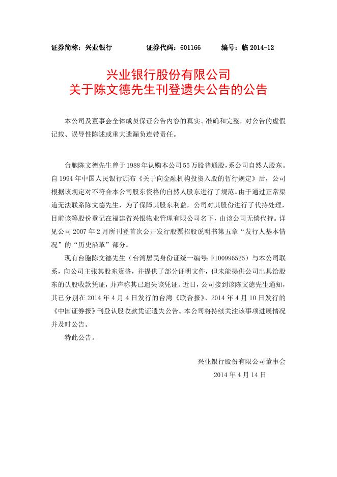 兴业银行关于陈文德先生刊登遗失公告的公告.doc