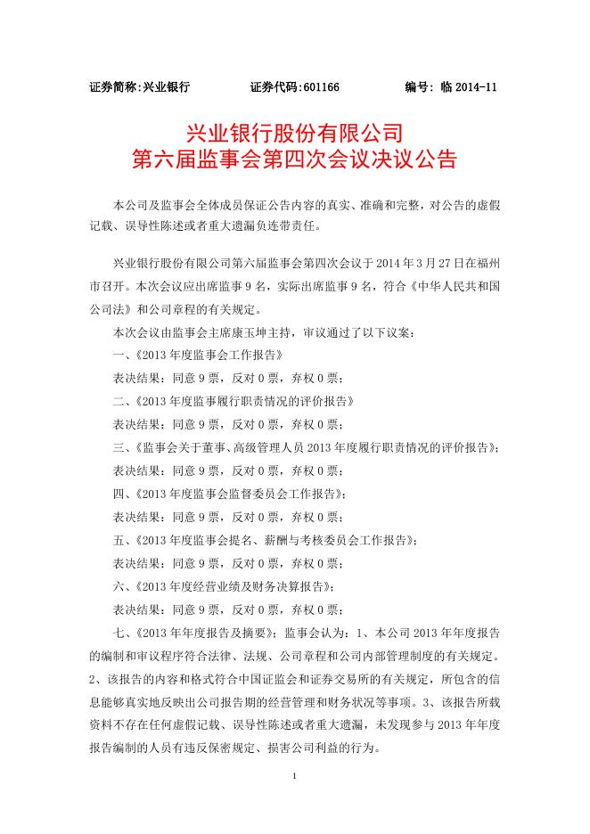 兴业银行股份有限公司第六届监事会第四次会议决议公告.doc