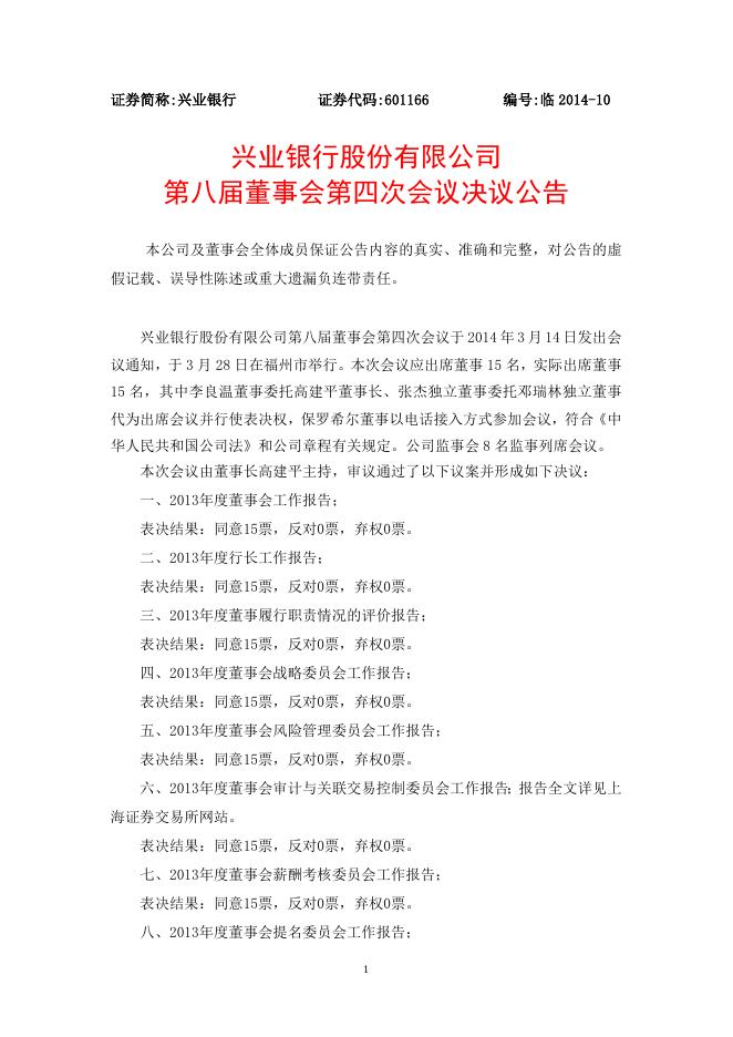 兴业银行股份有限公司第八届董事会第四次会议决议公告.doc