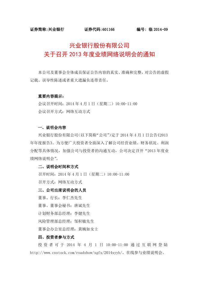 兴业银行股份有限公司关于召开2013年度业绩网络说明会的通知.doc