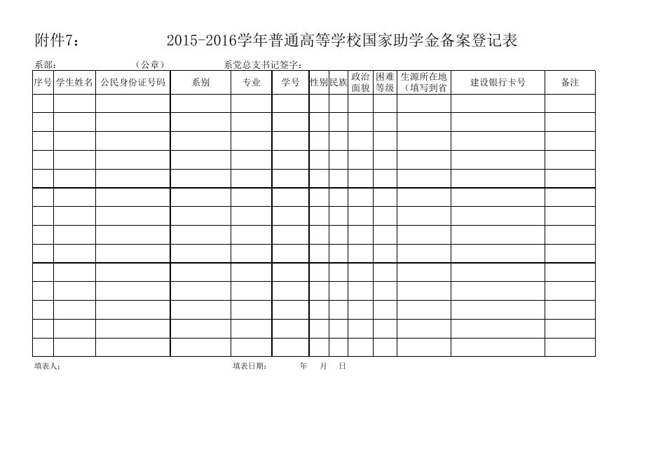 点击下载附件:附件7: 2015-2016学年普通高等学校国家助学金备案登记表.xls