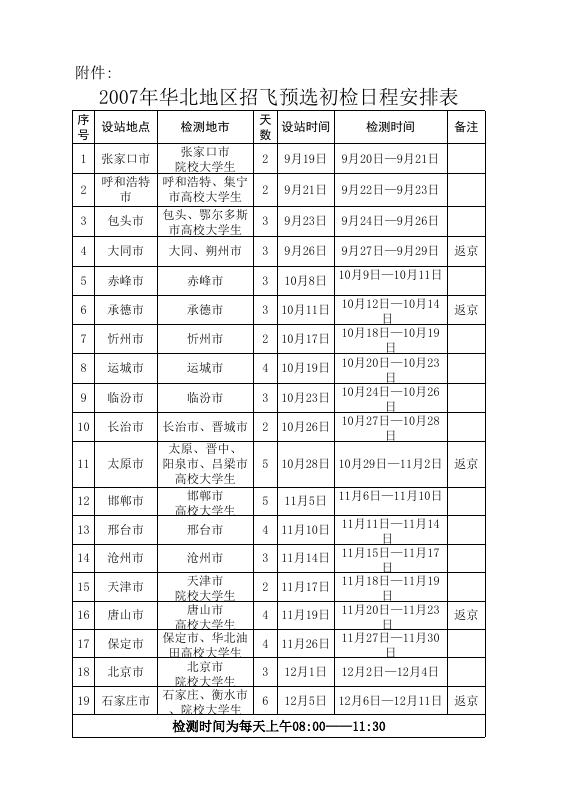 附件:2009年度华北地区招飞预选初检日程安排表.xls