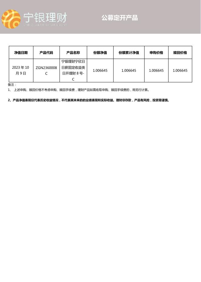 宁银理财宁欣日日薪固定收益类日开理财8号-C_净值披露_20231010.pdf