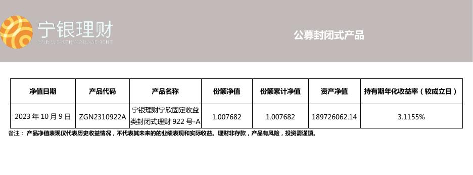 宁银理财宁欣固定收益类封闭式理财922号-A_净值披露_20231010.pdf