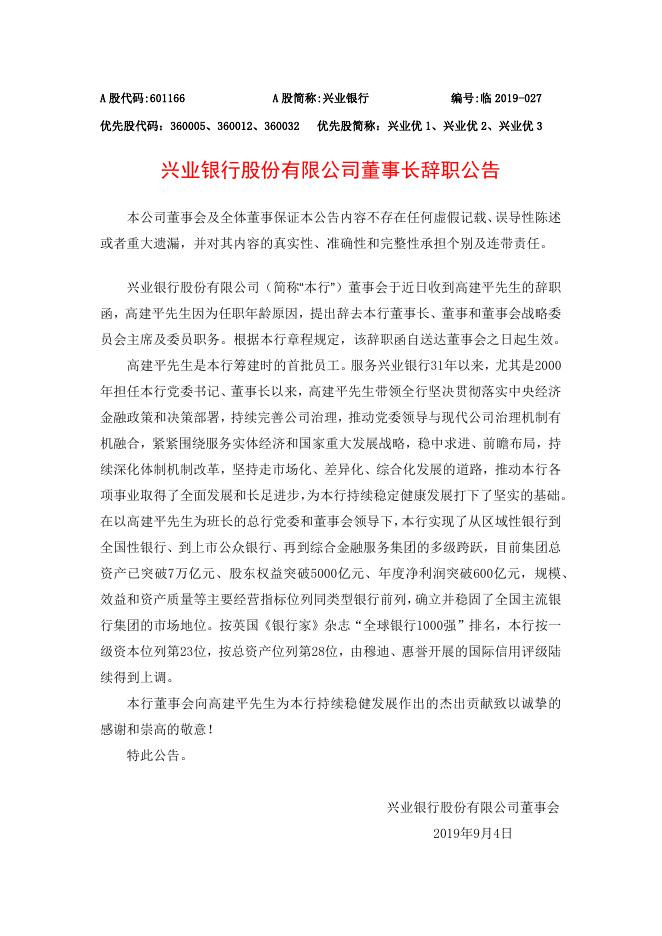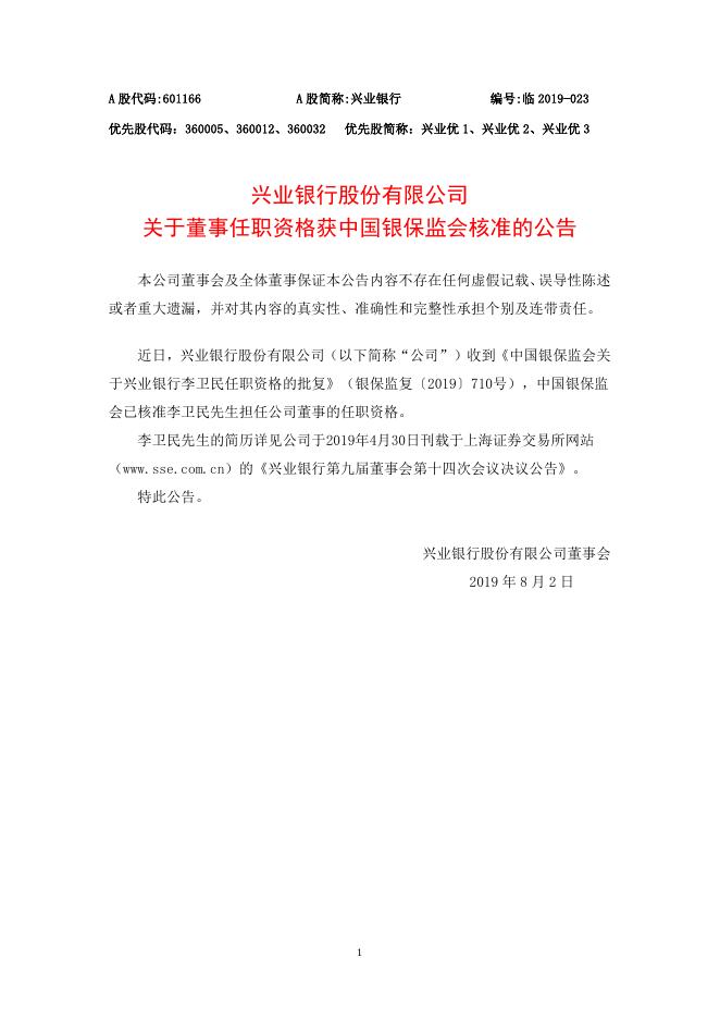 兴业银行关于董事任职资格获中国银保监会核准的公告.doc