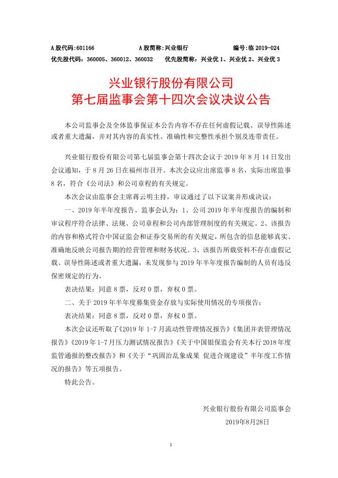 兴业银行第七届监事会第十四次会议决议公告.doc