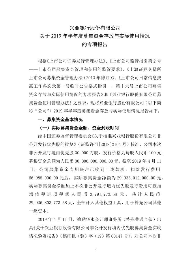 兴业银行股份有限公司关于2019年半年度募集资金存放与实际使用情况的专项报告-披露稿.docx