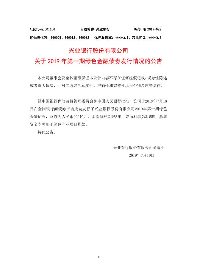 兴业银行关于2019年第一期绿色金融债券发行情况的公告.docx