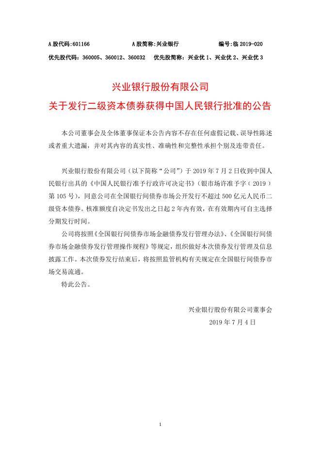 兴业银行关于发行二级资本债券获得中国人民银行批准的公告.doc