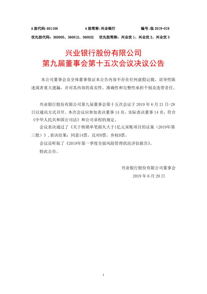 兴业银行第九届董事会第十五次会议决议公告.doc