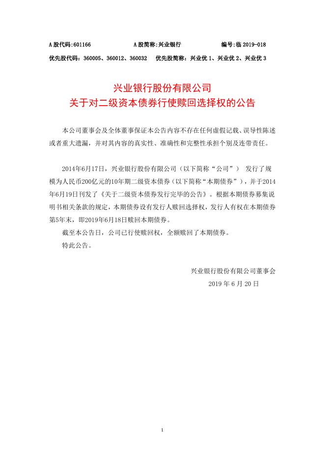 兴业银行股份有限公司关于对二级资本债券行使赎回选择权的公告.doc