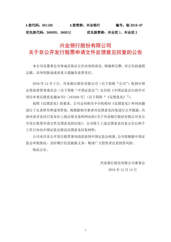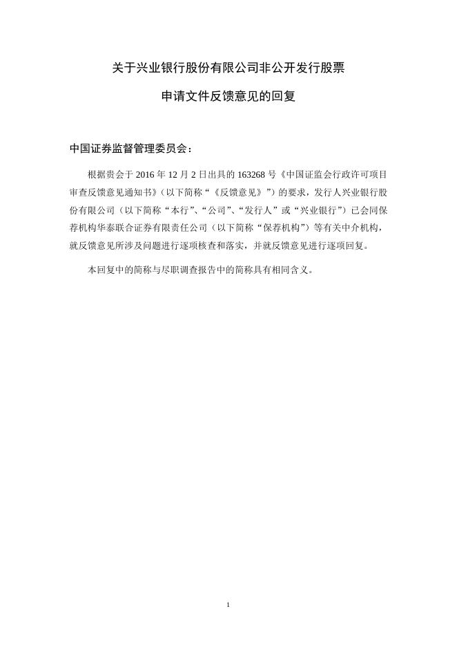 兴业银行股份有限公司关于非公开发行股票申请文件反馈意见回复的公告.doc