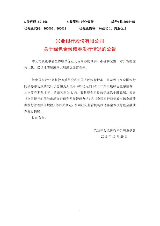 兴业银行股份有限公司关于绿色金融债券发行情况的公告.docx