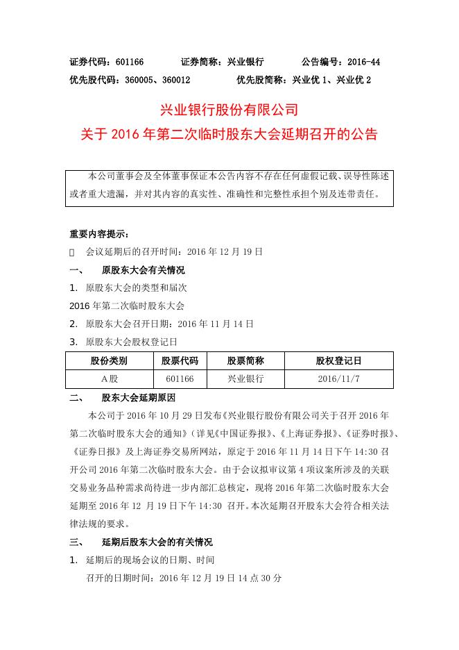 兴业银行股份有限公司关于2016年第二次临时股东大会延期召开的公告.docx