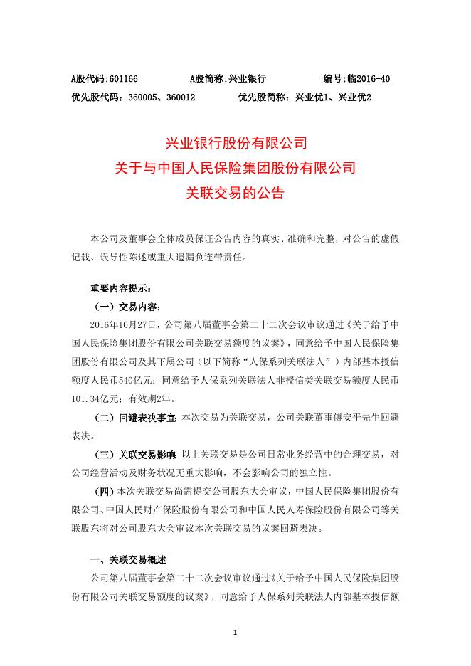 兴业银行股份有限公司关于与中国人民保险集团股份有限公司关联交易的公告.docx